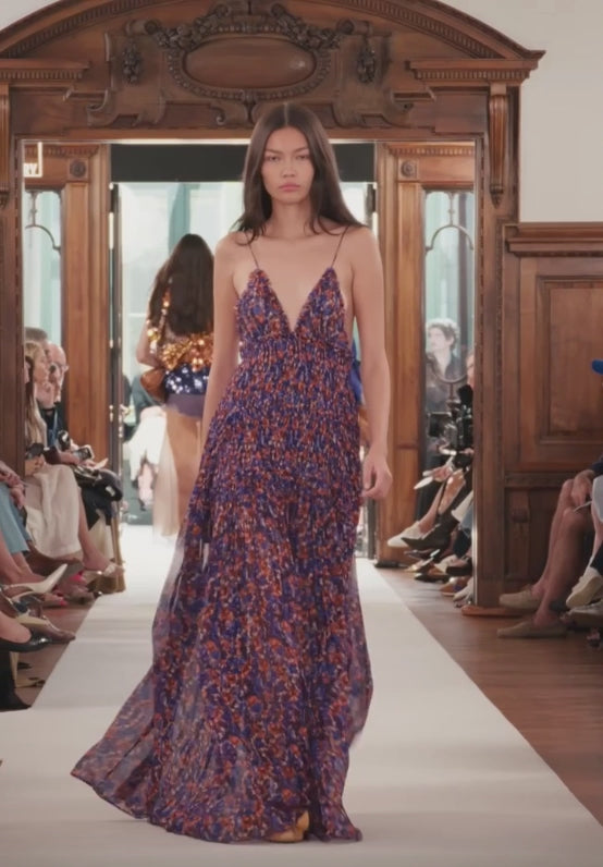Presentado en el Look 49 de la pasarela SS26 de Ulla Jhonson, este vestido encarna una visión etérea de elegancia contemporánea. Confeccionado en delicado chiffon de seda con textura crinkled, el diseño despliega suaves florales que evocan la sensibilidad minuciosa del puntillismo clásico, aportando profundidad y un romanticismo sutil a cada movimiento.